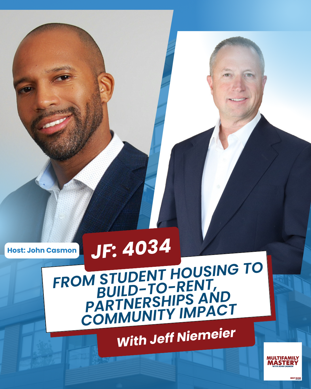 On this week’s episode of Multifamily Mastery, John Casmon interviews Jeff Niemeier. Jeff explains how his journey began in student housing, scaled into workforce rentals, and ultimately led him to focus on build-to-rent townhomes in Iowa. He shares how leveraging his unfair advantage of deep local knowledge and strong partnerships—has given him control over projects and higher margins than traditional multifamily. Jeff also details his entrepreneurial background in internet and cable services, his pivot into syndications, and why personal development, community involvement, and taking action are the cornerstones of long-term success.